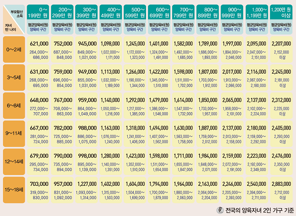 - 산정기준표의 표준양육비는 양육자녀가 2인인 4인 가구 기준, 자녀 1인당 평균양육비